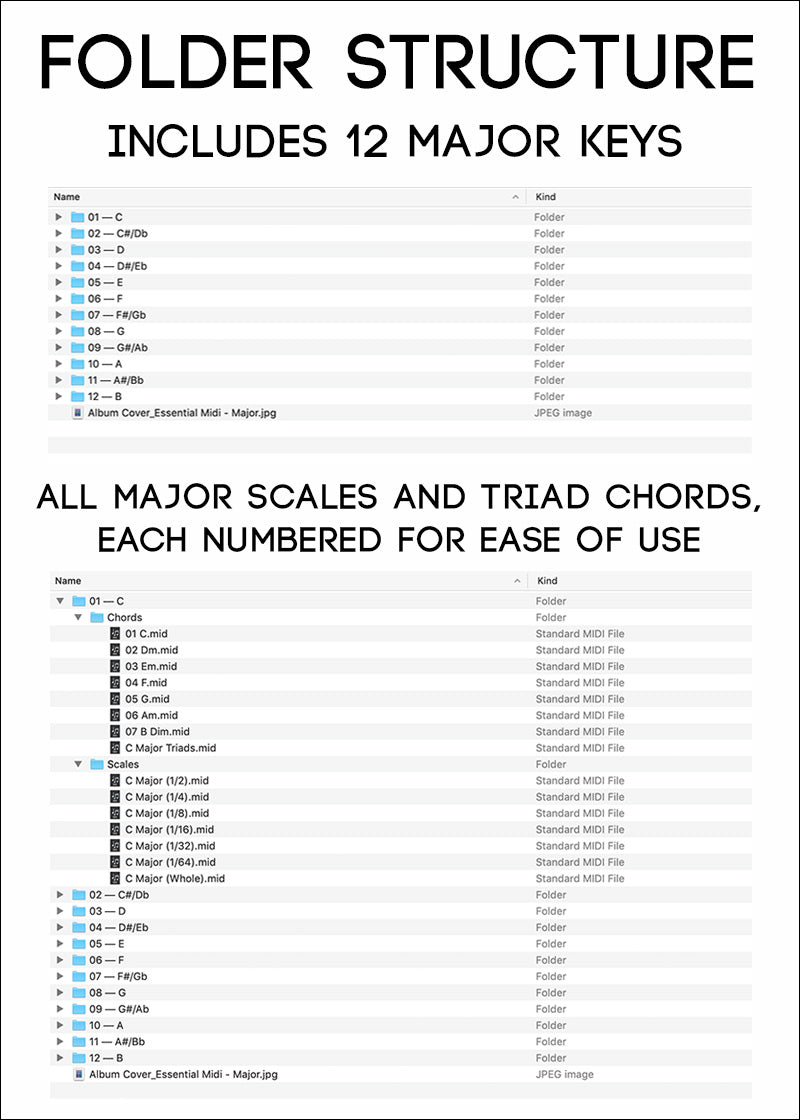 • 84 single note midi files for each major scale organized by major key and rhythm: Whole note, 1/2 note, 1/4 note, 1/8 note, 1/16 note, 1/32 note, 1/64